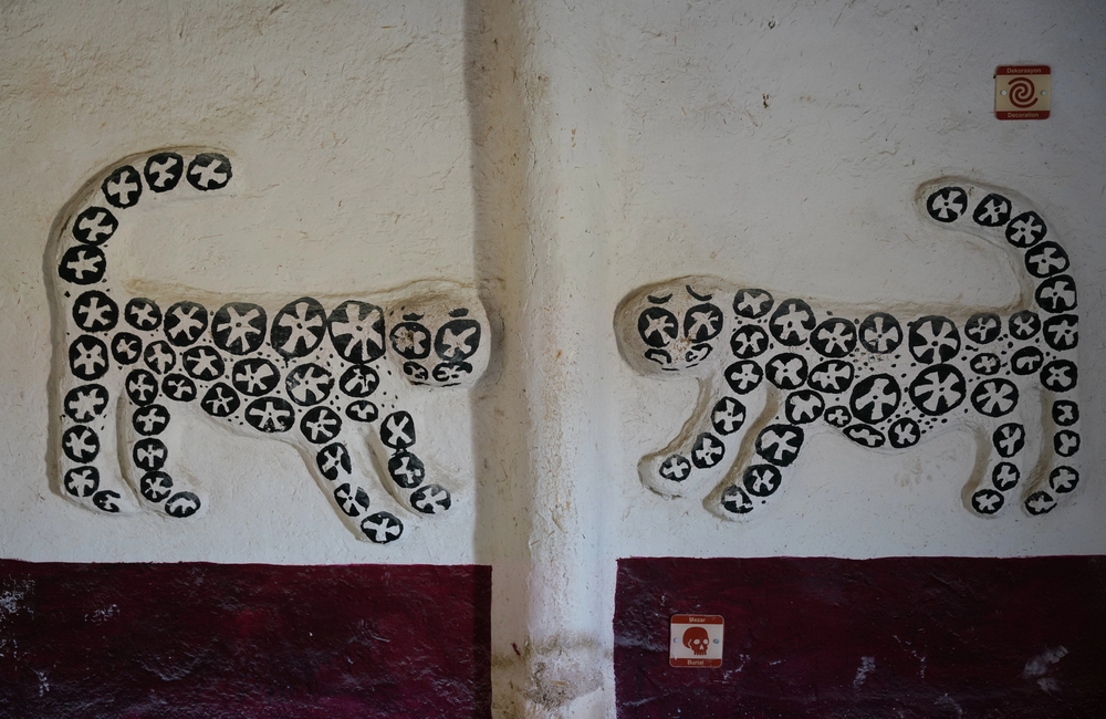 Walls were regularly plastered and repainted, creating a smooth white surface that served as a canvas for the community’s rich symbolic art.