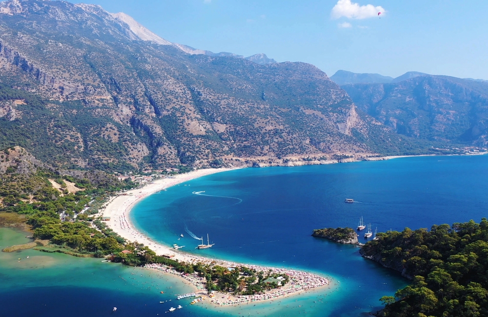 Just a short drive from the town center lies Ölüdeniz, home to one of the most photographed beaches on the planet. The Blue Lagoon, with its still and protected waters, creates a palette of turquoise and emerald tones that feels almost unreal. This serene bay is ideal for swimming, paddleboarding, and sunbathing, making it a must-visit for both families and solo travelers seeking tranquility.