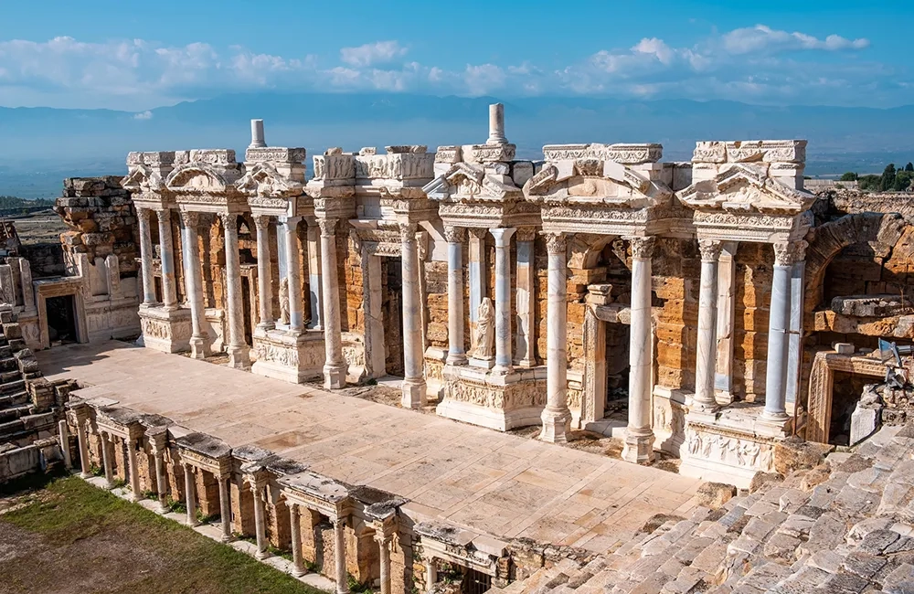 Adjacent to the terraces lies Hierapolis, an ancient Greco-Roman city with a rich history dating back to the 2nd century BCE. Hierapolis was an important spa city in antiquity, renowned for its healing thermal waters. The city flourished under Roman rule, and many structures, such as temples, theaters, and bath complexes, still stand today, offering a glimpse into the past. Walking through Hierapolis feels like stepping back in time, as you explore its marble streets, monumental gates, and grand colonnades.