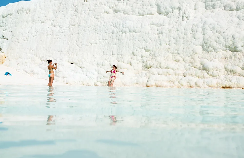 The iconic white terraces of Pamukkale are formed by cascading thermal waters rich in calcium carbonate. The terraces create natural pools that range from shallow wading areas to deeper soaking pools. Visitors can take off their shoes and walk along the travertine formations, feeling the warm mineral water beneath their feet. Sunrise and sunset are particularly magical times to visit, as the terraces glow in golden light, offering perfect photo opportunities.