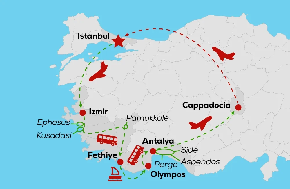 Experience the best of Turkey with a 14-day Istanbul, Ephesus, Pamukkale, Fethiye & Olympos Gulet Cruise, Antalya, and Cappadocia tour. Explore iconic landmarks like the Blue Mosque, Hagia Sophia, and ancient Ephesus. Relax in Pamukkale’s thermal pools and enjoy a memorable Mediterranean cruise from Fethiye to Olympos. Discover Antalya’s stunning old town and waterfalls before heading to Cappadocia for fairy chimneys, underground cities, and an unforgettable hot-air balloon ride. This Turkey tour combines culture, history, nature, and adventure—ideal for travelers seeking a complete, unforgettable holiday.