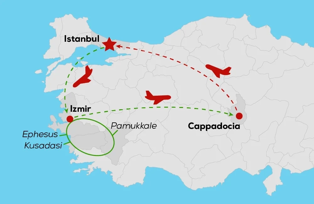 Experience the best of Turkey on this perfectly balanced 8-day journey. Begin in vibrant Istanbul, exploring its historic Old City, palaces, mosques, bazaars, and a scenic Bosphorus cruise. Continue to the Aegean region to discover ancient Ephesus, the House of the Virgin Mary, charming Sirince village, and the stunning white terraces of Pamukkale. Fly onward to magical Cappadocia, famous for its fairy chimneys, underground cities, rock-cut churches, and unique valleys. Enjoy guided tours, comfortable transfers, selected meals, and unforgettable cultural experiences, with optional hot air ballooning to complete your adventure.
