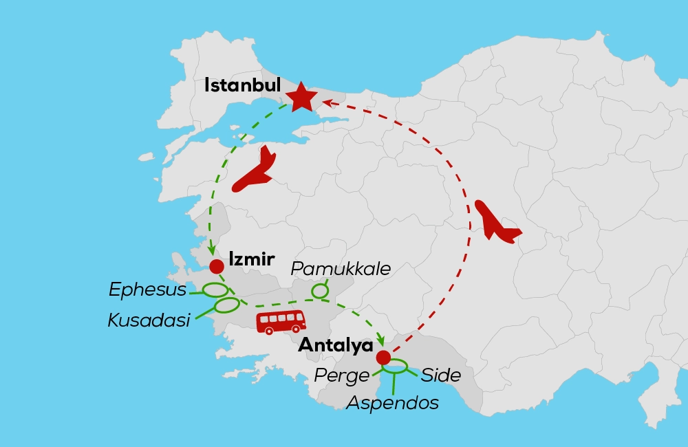 Embark on an unforgettable 5-day Ephesus, Pamukkale, and Antalya tour showcasing Turkey’s best historical and natural attractions. Explore the ancient city of Ephesus, walk through its marble streets, and visit the House of Virgin Mary. Discover Pamukkale’s white travertine terraces and relax in the thermal pools of Hierapolis. Continue to Antalya, the jewel of the Mediterranean, where you’ll enjoy charming old-town streets, waterfalls, and golden beaches. This 5-day Turkey tour is ideal for travelers seeking culture, nature, and relaxation.
