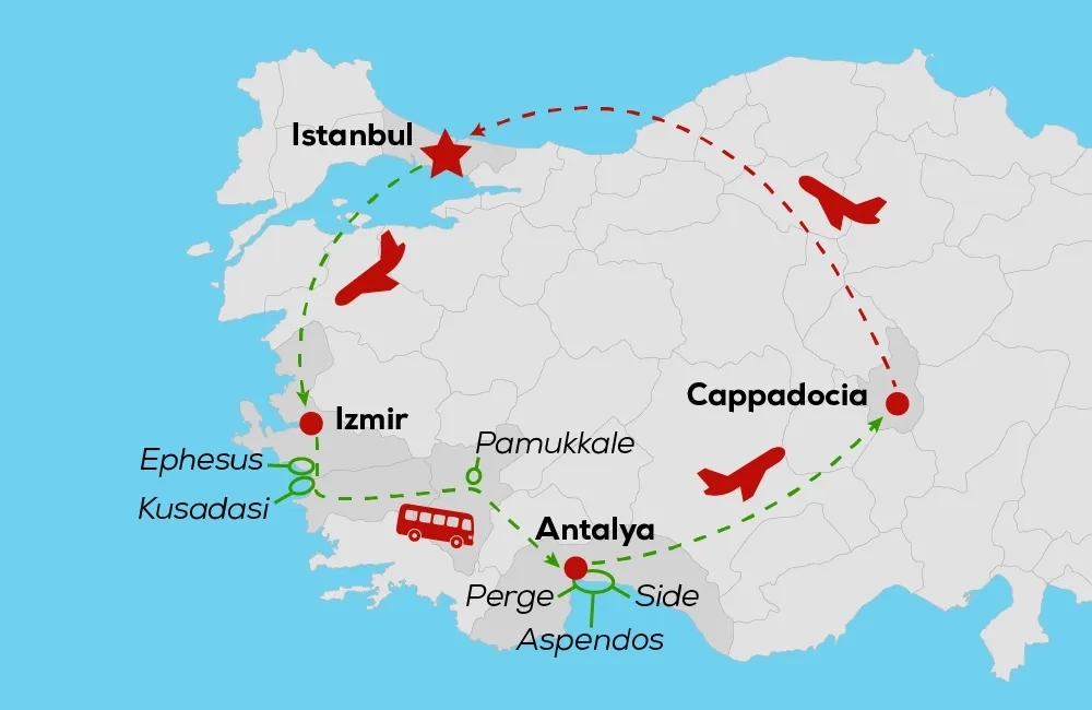 This 10 Day Turkey Tour is the perfect way to explore Turkey’s top destinations in one seamless journey. Start in Istanbul, visiting iconic sites like Hagia Sophia, the Blue Mosque, and the Grand Bazaar. Fly to Cappadocia for its famous hot air balloon ride, fairy chimneys, and unique landscapes. Continue to Ephesus and Pamukkale, discovering ancient ruins, the Temple of Artemis, and white travertine terraces. End your tour in sunny Antalya, enjoying beautiful beaches and historic Kaleiçi. With expert guides, small groups, and smooth travel, this tour delivers an unforgettable Turkey experience.